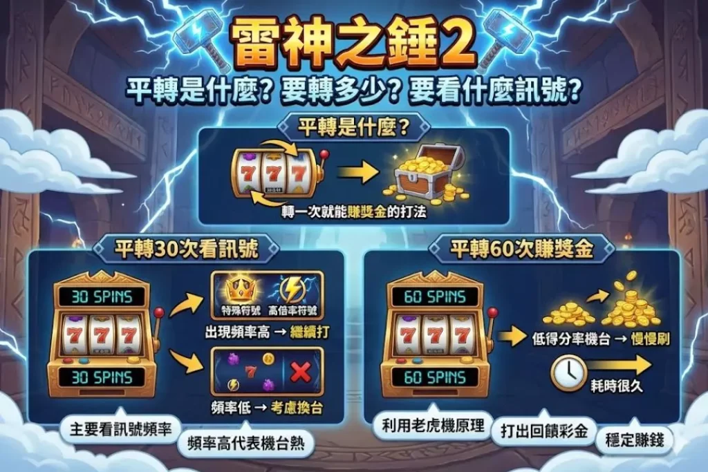 如果今天你雷神之錘2平轉到60次的時候,那麼跟30次平轉相同,主要看訊號去操作,不然就是用低得分率的機台,善用老虎機原理打出回饋彩金出來,這樣的時間會耗時很久,不過就是可以穩定賺錢就是,主要還是在每一次平轉的過程中找到高倍率訊號才可以獲勝。